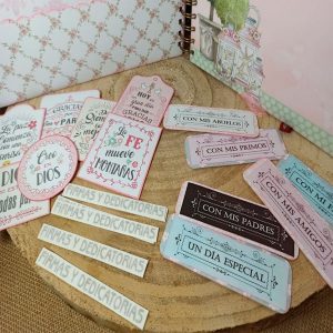 Compuesto por 5 láminas de scrapbooking de temática comunión y 10 hojas de 300 grs. en color crema para pegar fotos o hacer dedicatorias.