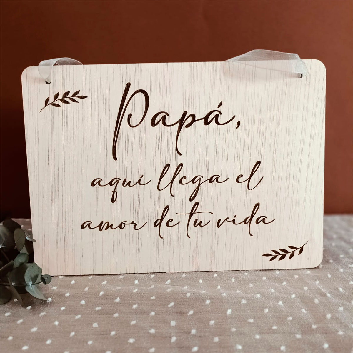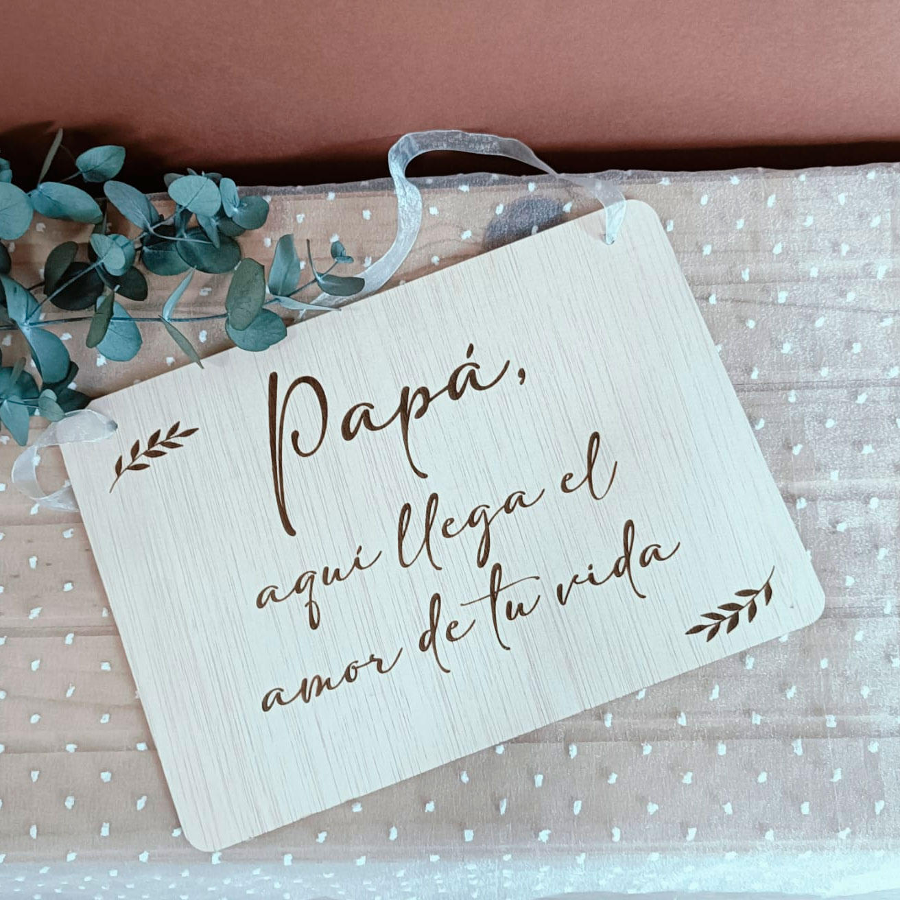 ¿Te imaginas la emoción de tu padre y los invitados cuando lean este mensaje tan especial? Nuestro cartel de madera laminada (30×21 cm, 4 mm de grosor) es perfecto para anunciar la llegada de la novia y crear un recuerdo inolvidable.