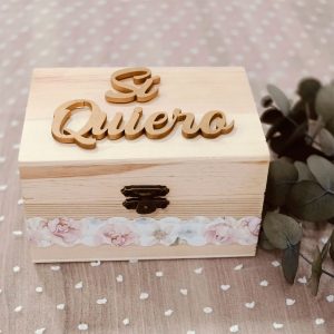 Cajita de madera ideal para llevar las arras al altar, la cual lleva grabado en la tapa la frase «Sí Quiero», en madera DM de 3 mm., recortada a láser