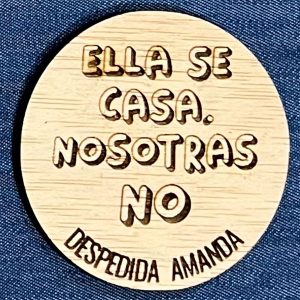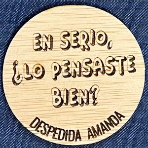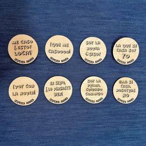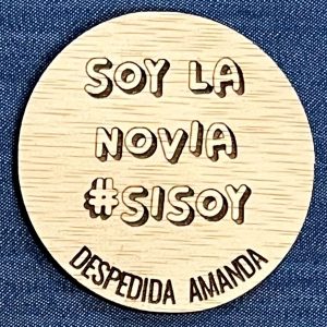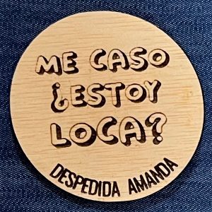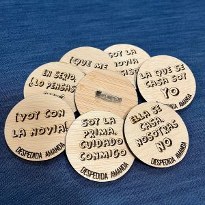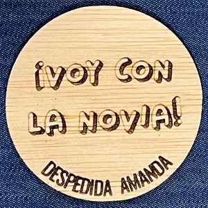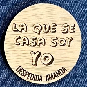 Chapa despedida madera, grabada a láser con bonitos mensajes, perfecta para la despedida de soltera de vuestra amiga.