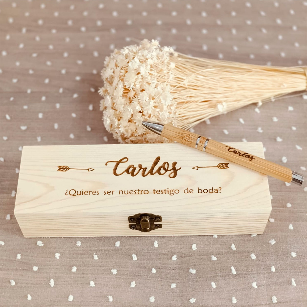 Sorprende a tu testigo con un estuche de madera grabado a láser con su nombre y un bolígrafo de bambú, también personalizado. Un regalo exclusivo, práctico y con mucho estilo, perfecto para agradecer su apoyo en un día tan importante.