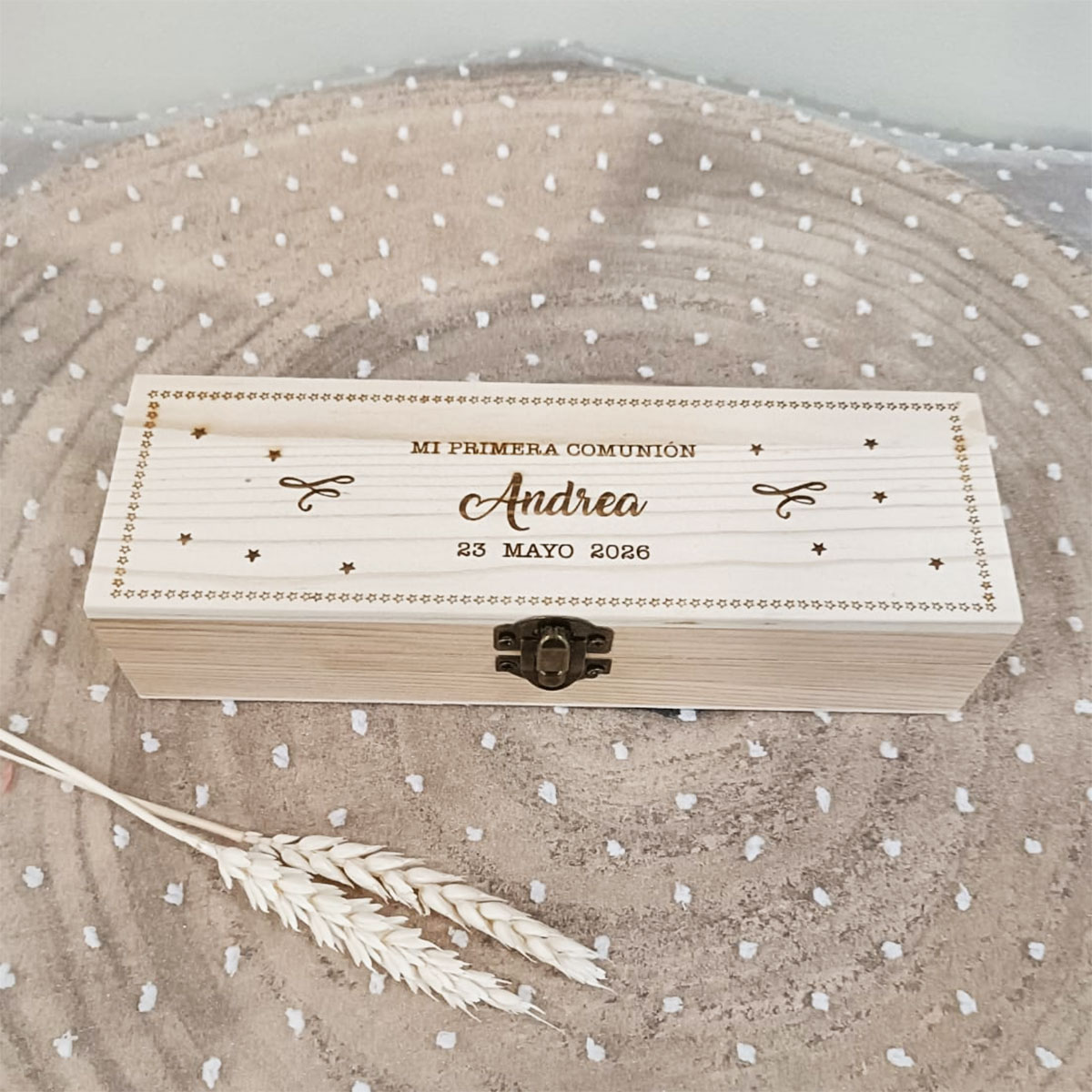 Estuche de madera decorado con el nombre del niñ@ y la fecha del evento.