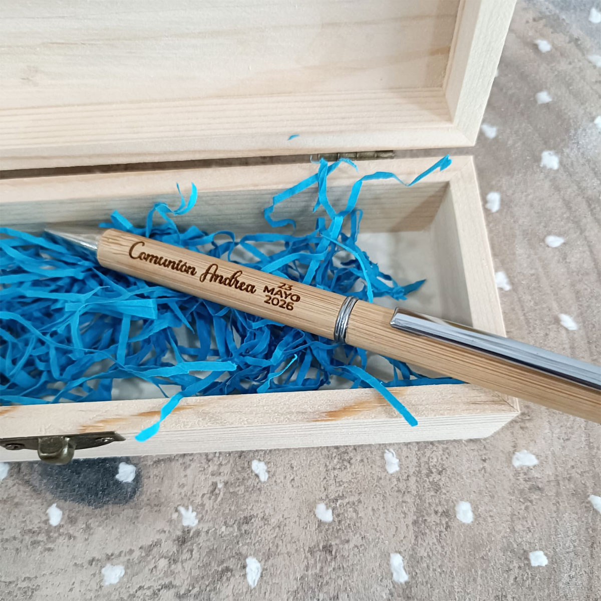 Incluye también un bolígrafo con cuerpo de bambú y grabado con el nombre del niñ@