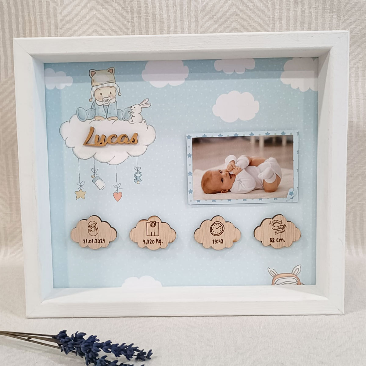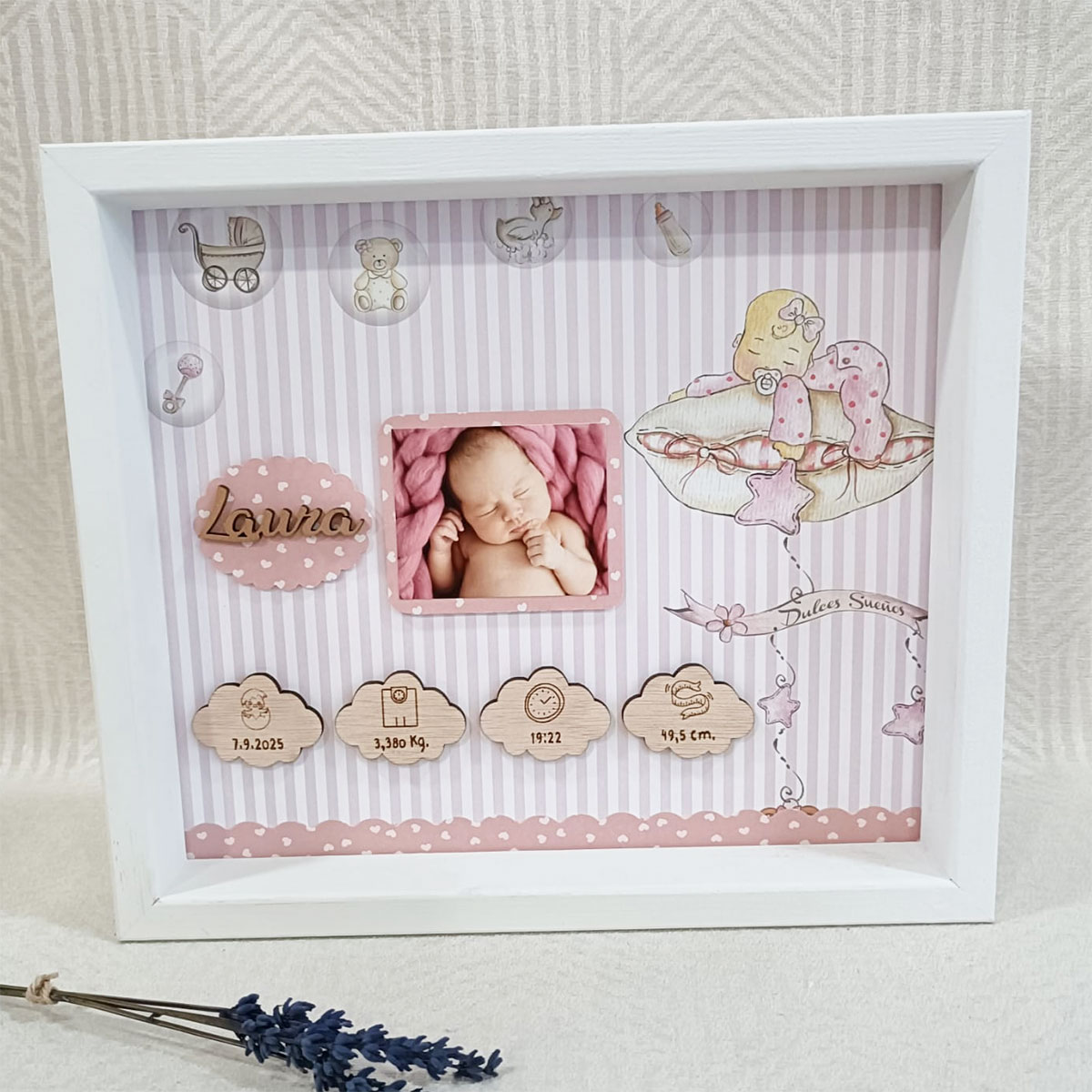 Un bonito marco para recordar todos los datos del nacimiento del bebé.