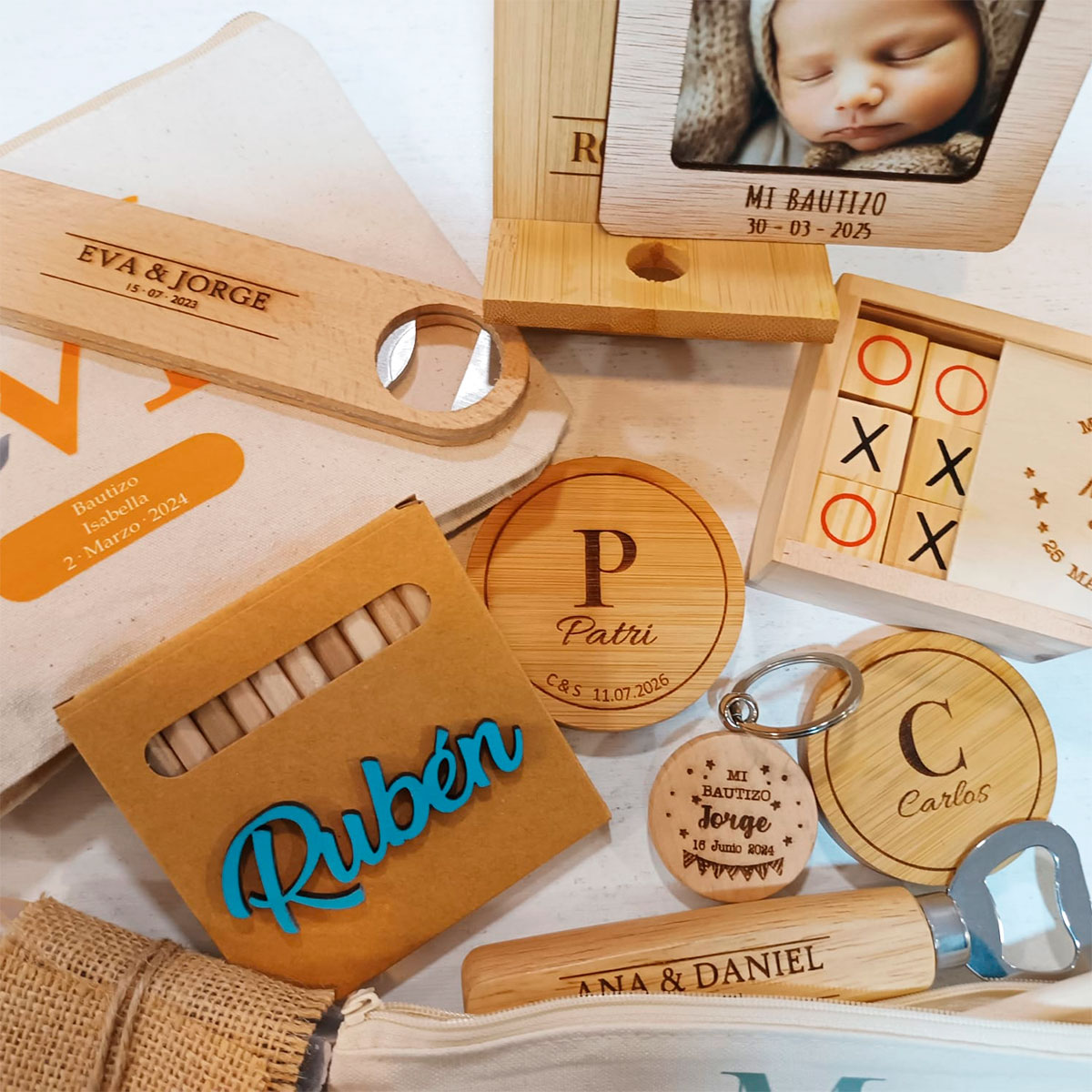 Hemos creado un Mini Pack de Prueba para que veas, toques y sientas cómo serán tus detalles antes de hacer un pedido más grande. Te lo enviamos en una cajita preparada como si fuera un regalo con 6 modelos de diferentes detalles personalizados con vuestros datos facilitados, y presentados como los recibirían tus invitados.