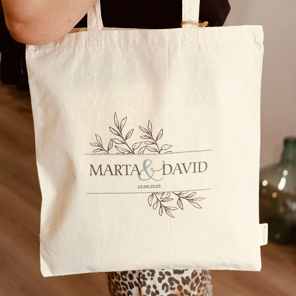 Una gran bolsa de algodón personalizada con vuestros nombres y fecha del enlace, incluidos dentro de un bonito diseño.
