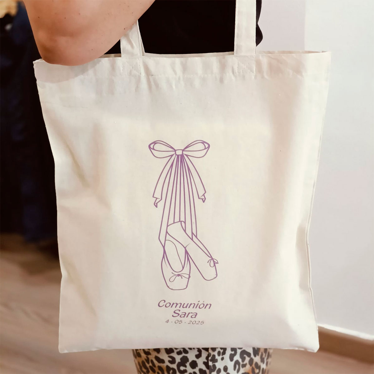 Una gran bolsa de algodón personalizada con el nombre del niñ@ y la fecha de la comunión.