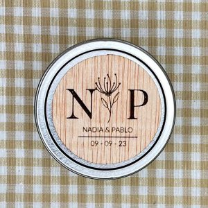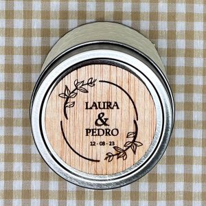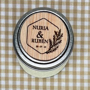Vela aromática con etiqueta servida envase metálico y cuerpo revestido de hilo en variada gama de colores.  Con etiqueta magnética en madera laminada 4 mm. grabada a láser con vuestros datos.